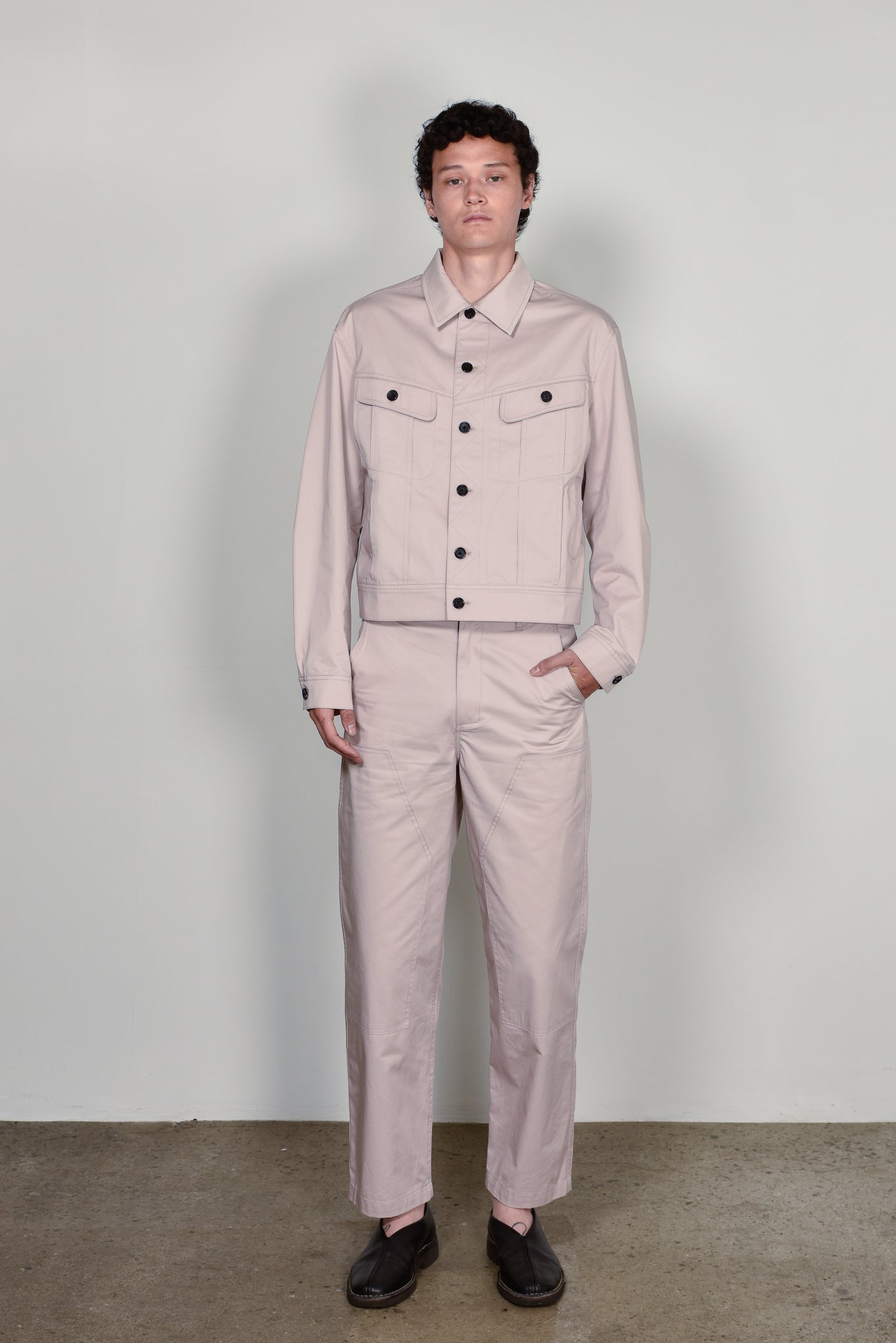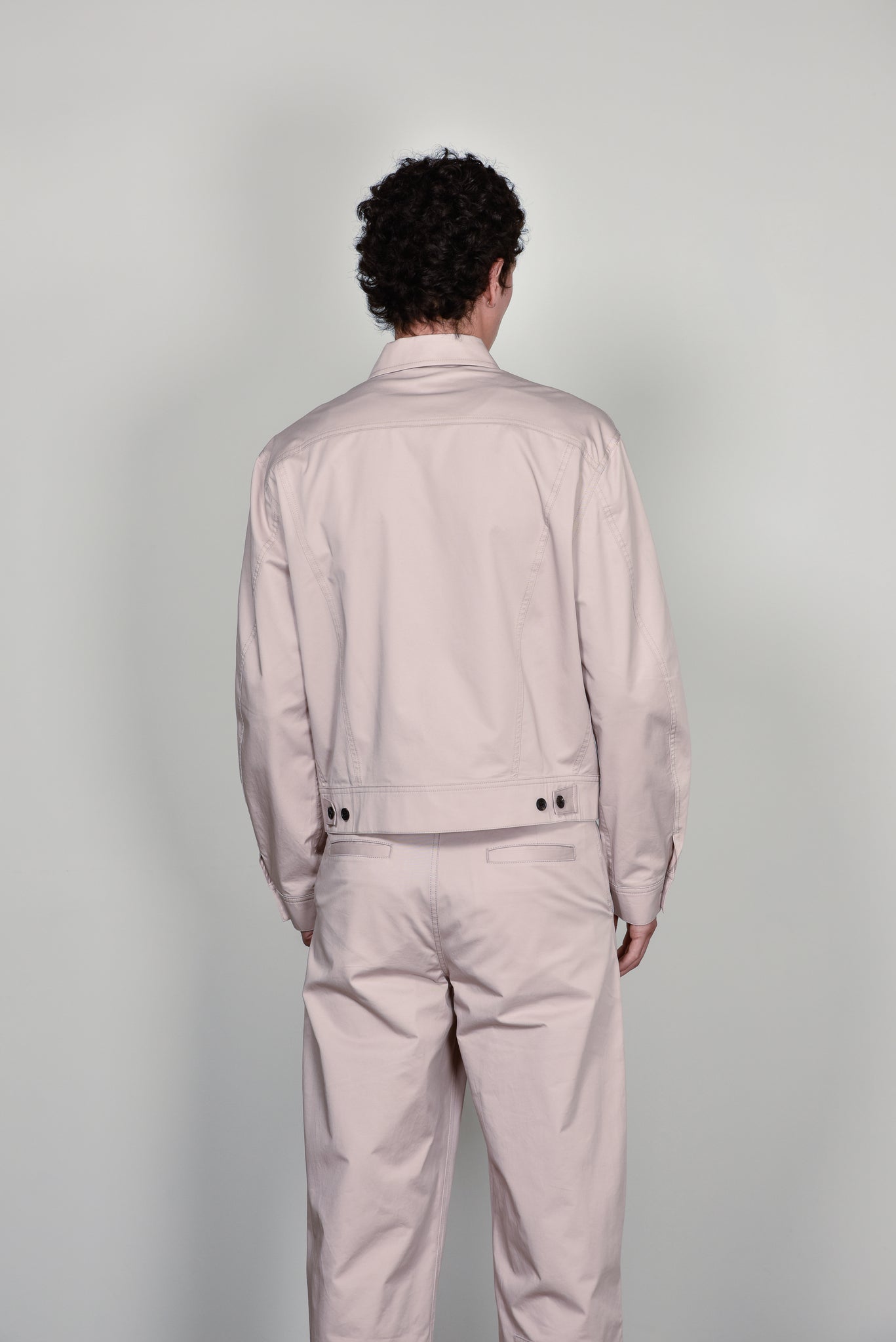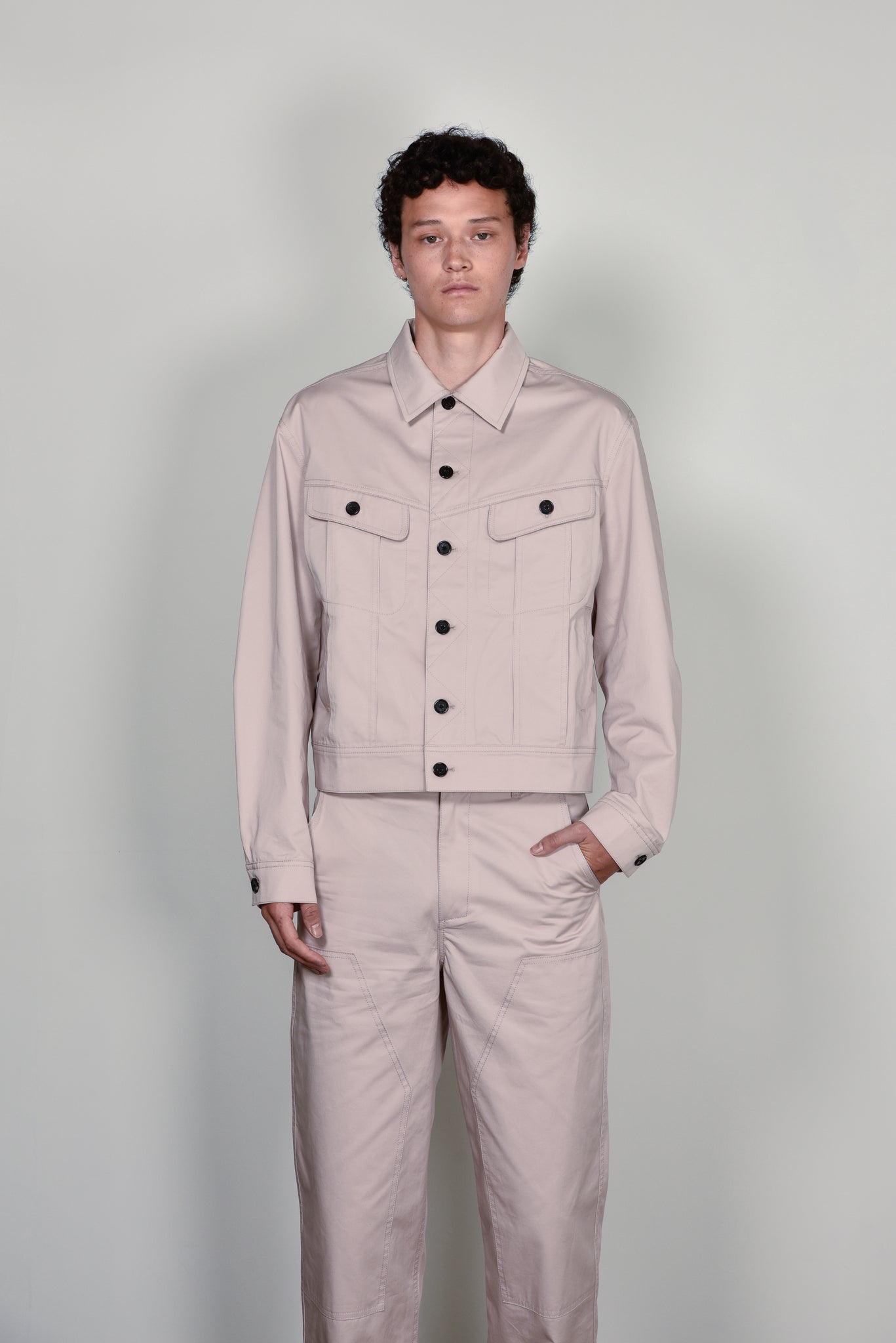 Light cotton jacket with front patch pockets. Hand carved horn buttons. Adjustable waist. Cropped body and relaxed fit.