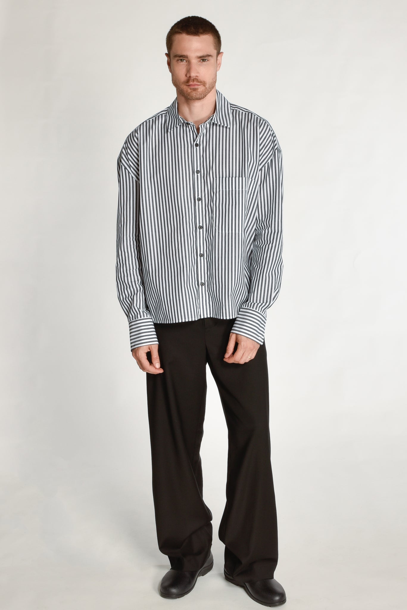 Relaxed fit, long sleeve shirt. Cropped body and longer sleeve. Hand carved Italian horn buttons. Longer sleeve placket detail.