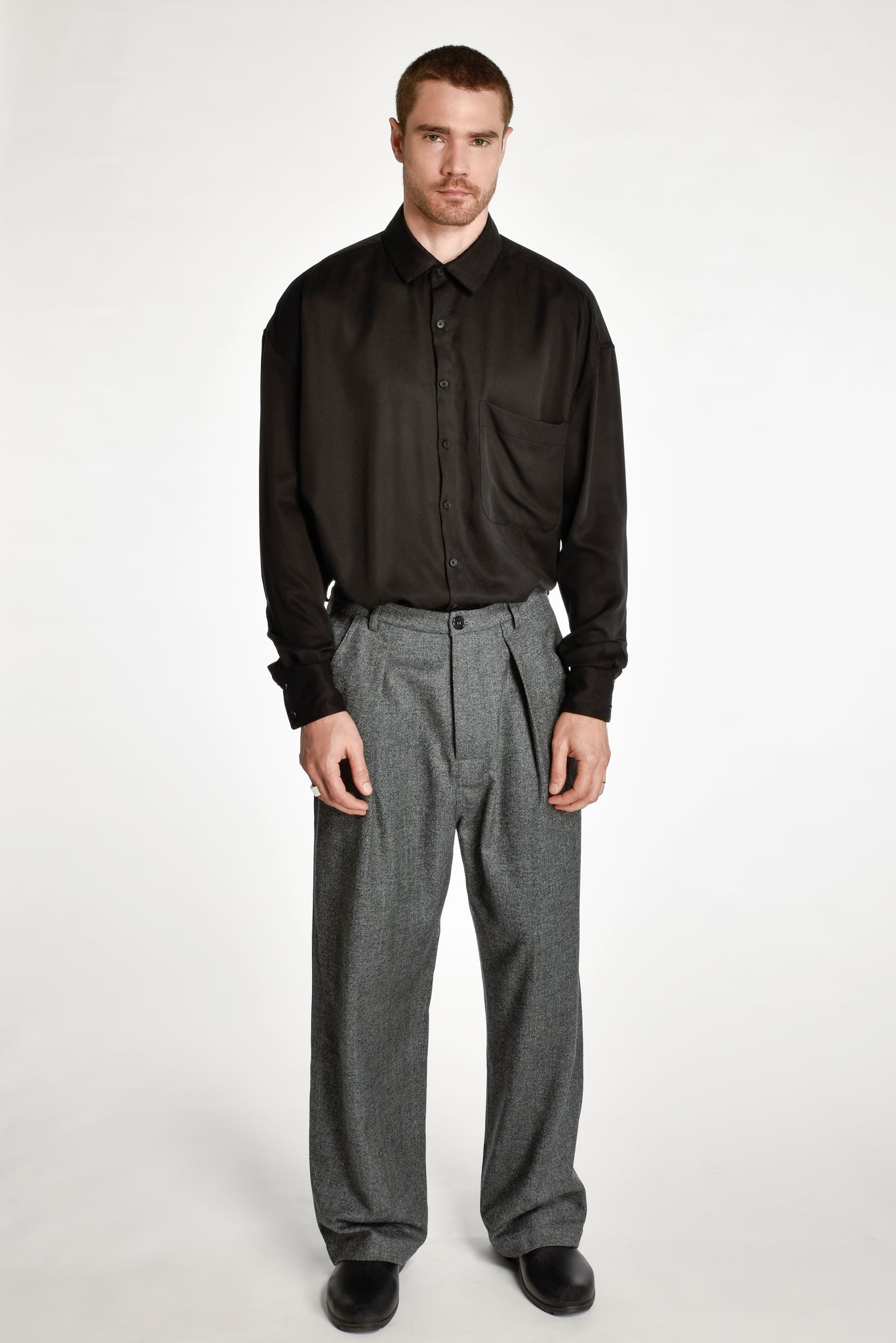 Oversized long sleeve shirt with patch pocket. Cropped fit . Longer sleeve placket. Black hand carved horn buttons.