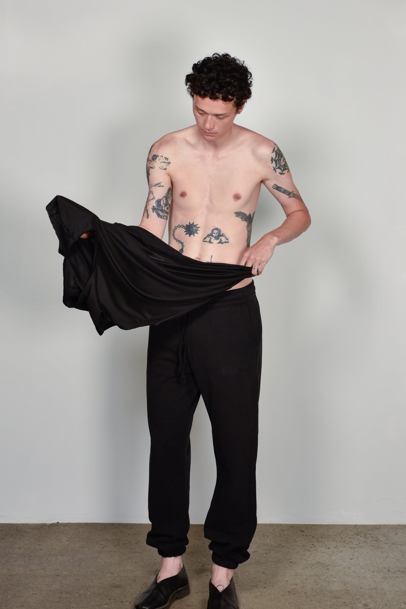 Relaxed fit joggers with elastic waist and drawstring. Elasticated cuff at the ankle. Side pockets and 1 back pocket. Washed fleece-back cotton jersey. R.Swiader tonal embroidery. Fits true to size.
