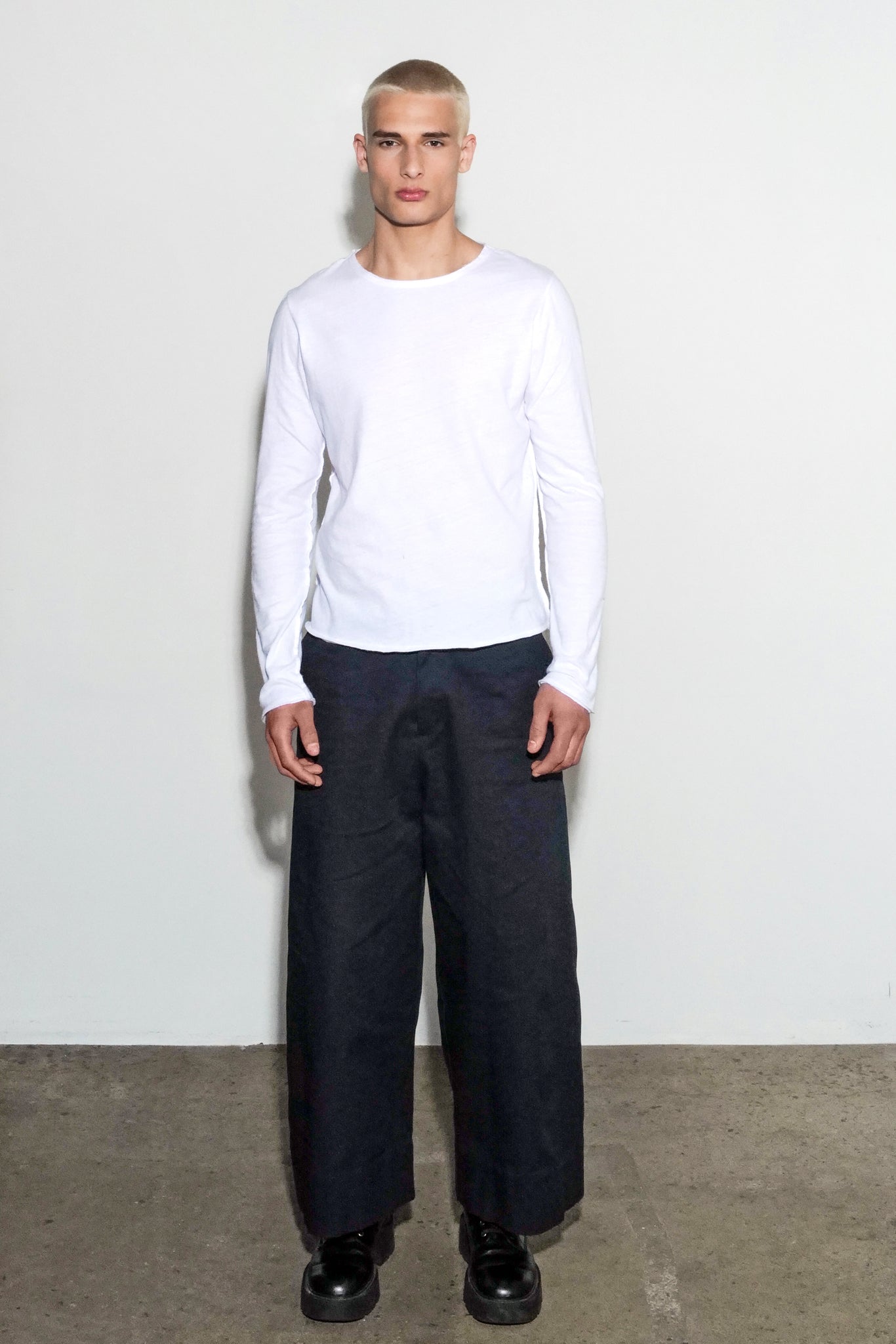 Long sleeve crew with raw edge finished neck and sleeves. French seam construction. Pre washed and super soft for extra comfort. Relaxed fit with longer sleeve.