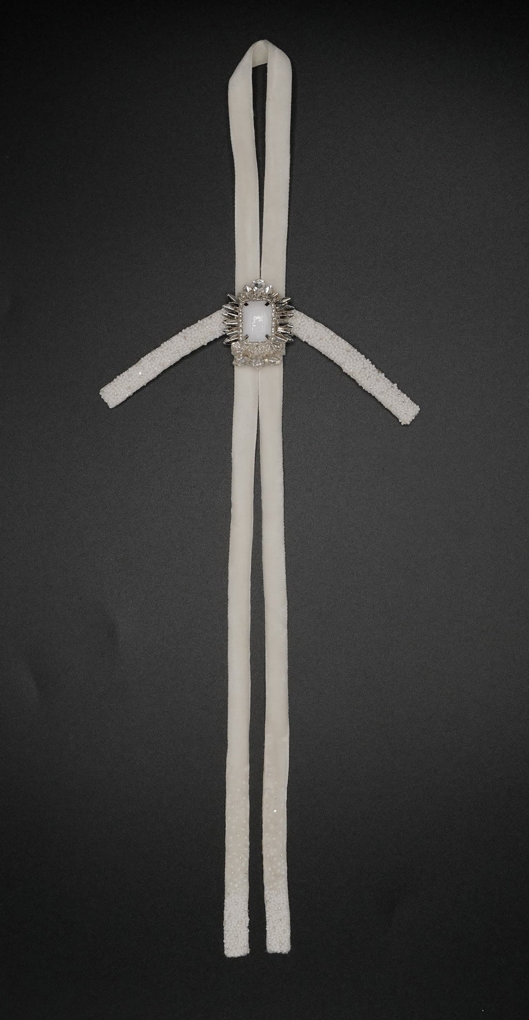 Bolo style tie. White glass beads on velvet ribbon with silver detail.