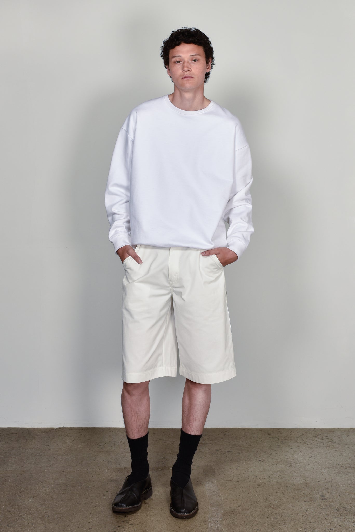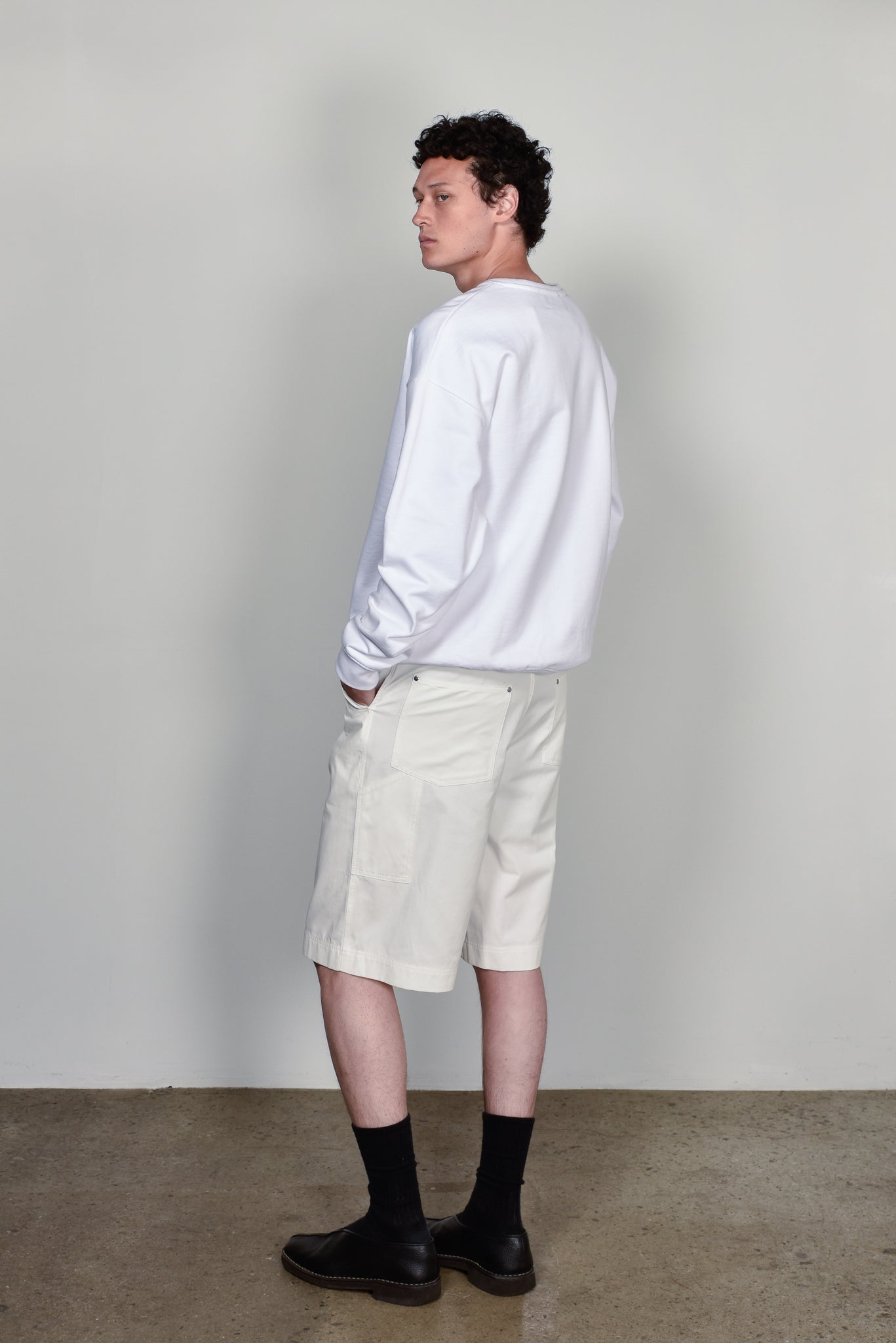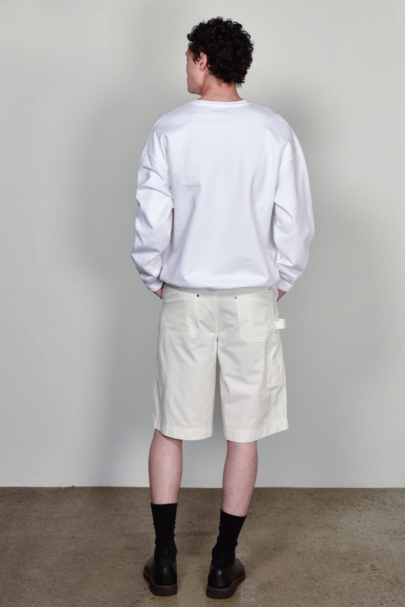 Canvas carpenter shorts with zip fly closure. Back pockets. Relaxed fit.